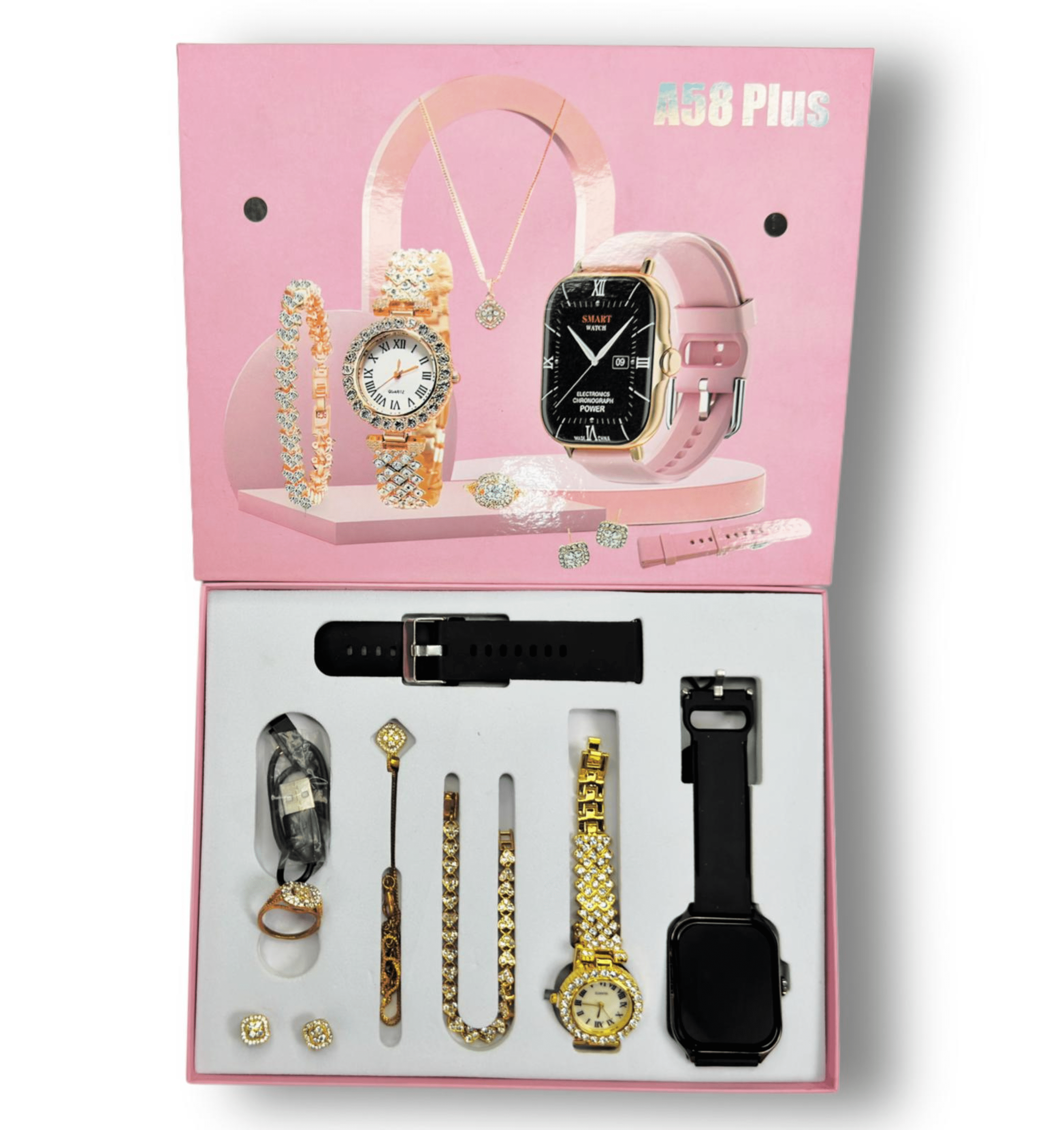 A58 Plus Smartwatch Couple Sets 1 piece of Quartz watch for Women 1 piece of 2.01″ HD display for men Smartwatch 32MB ROM – 45mm Watch Size 296*240 Resolution APP: Lefun Health JL6958C3 Chip Multi Menu Styles Heart Rate, Blood Pressure, Blood Oxygen Monitor Pedometer IP67 Waterproof BT Calling, answer and dial BT Remote Camera, BT Music Multi Sports Modes Social APP Message Reminder For iOS 9.0, Android 5.0 above