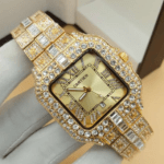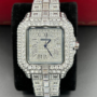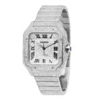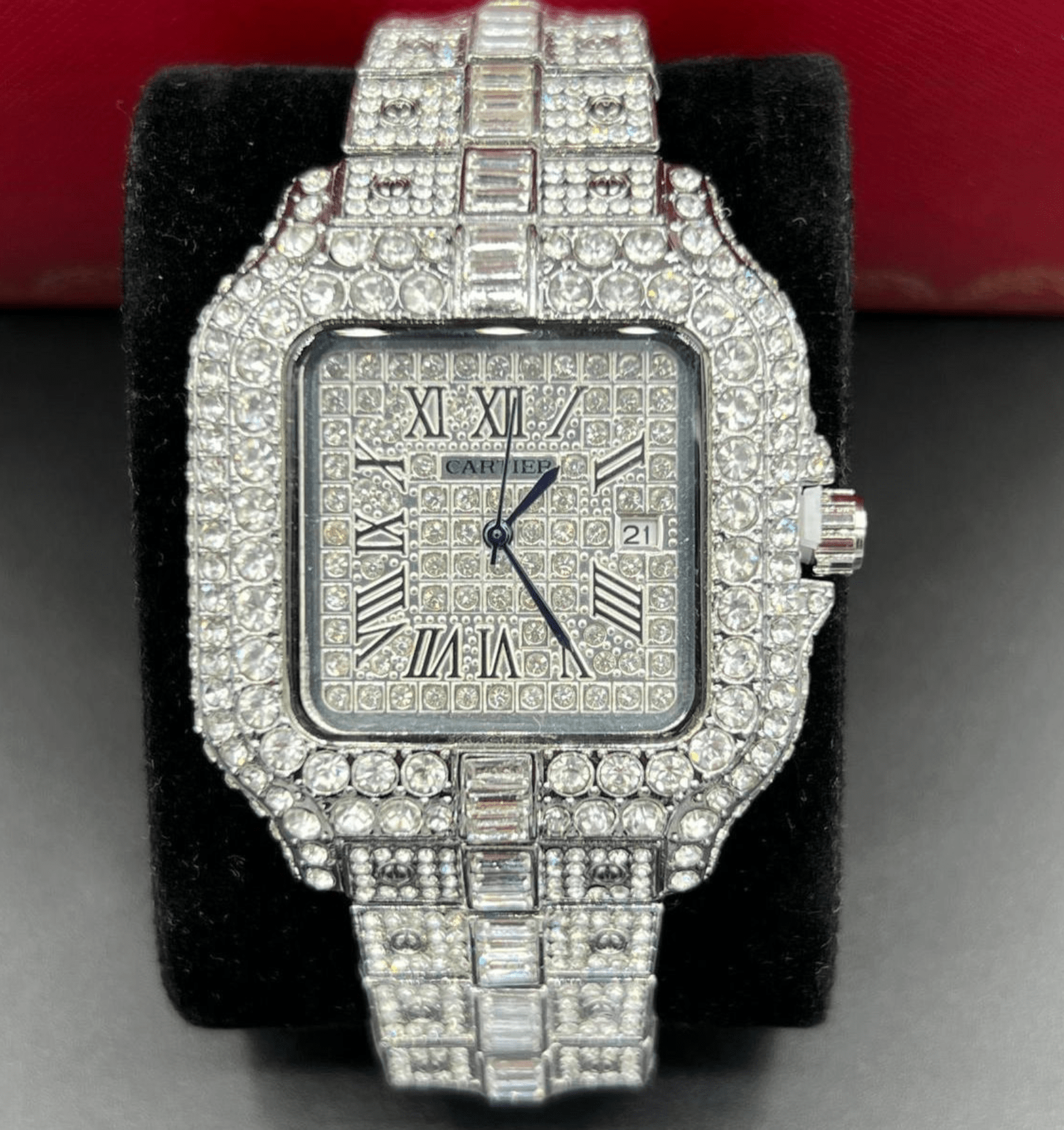 The watch in the image is a Cartier timepiece. It features an iced-out or fully diamond-encrusted design. The watch has a rectangular case with a luxurious and bold aesthetic, entirely covered with diamonds, including the bezel, dial, and bracelet. The dial is adorned with black Roman numeral hour markers, and it has blue steel hands that add a subtle contrast to the sparkling background. There is also a date window at the 6 o’clock position. This watch exudes opulence and is designed for someone who appreciates high-end, attention-grabbing luxury accessories.